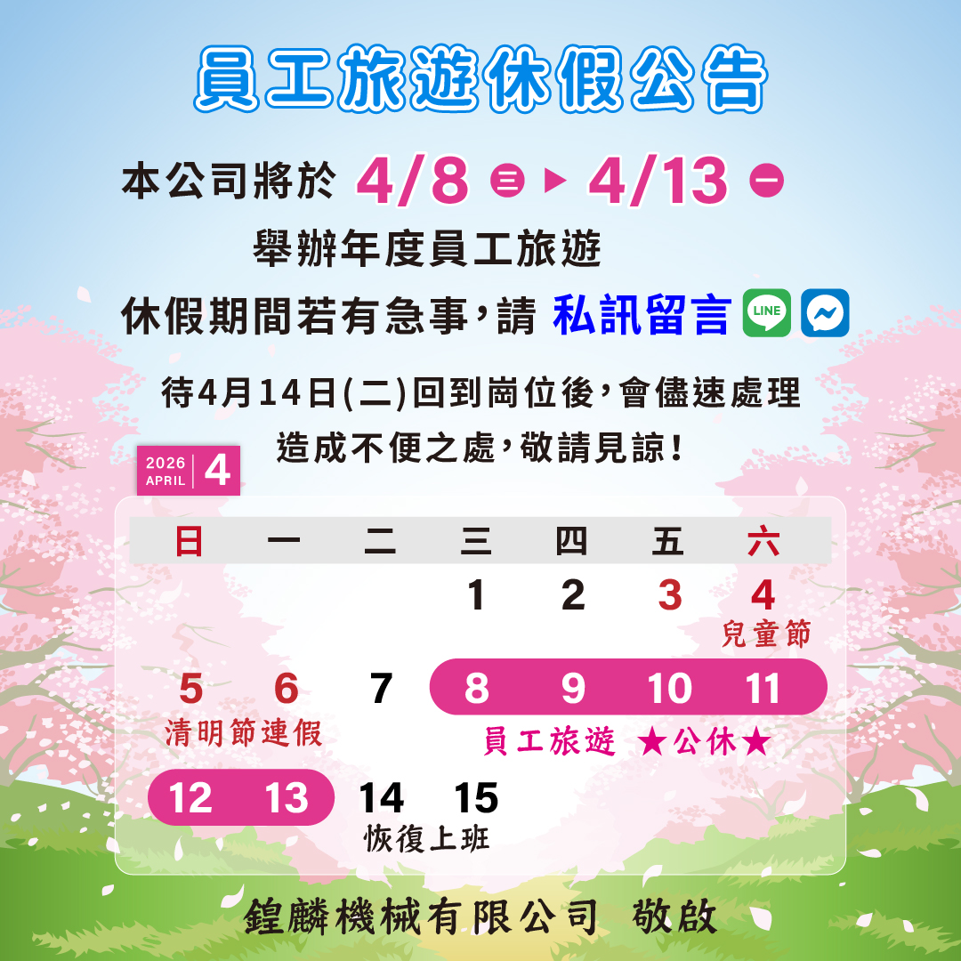 2026/4/8(三)至4/13(一)年度員工旅遊公告