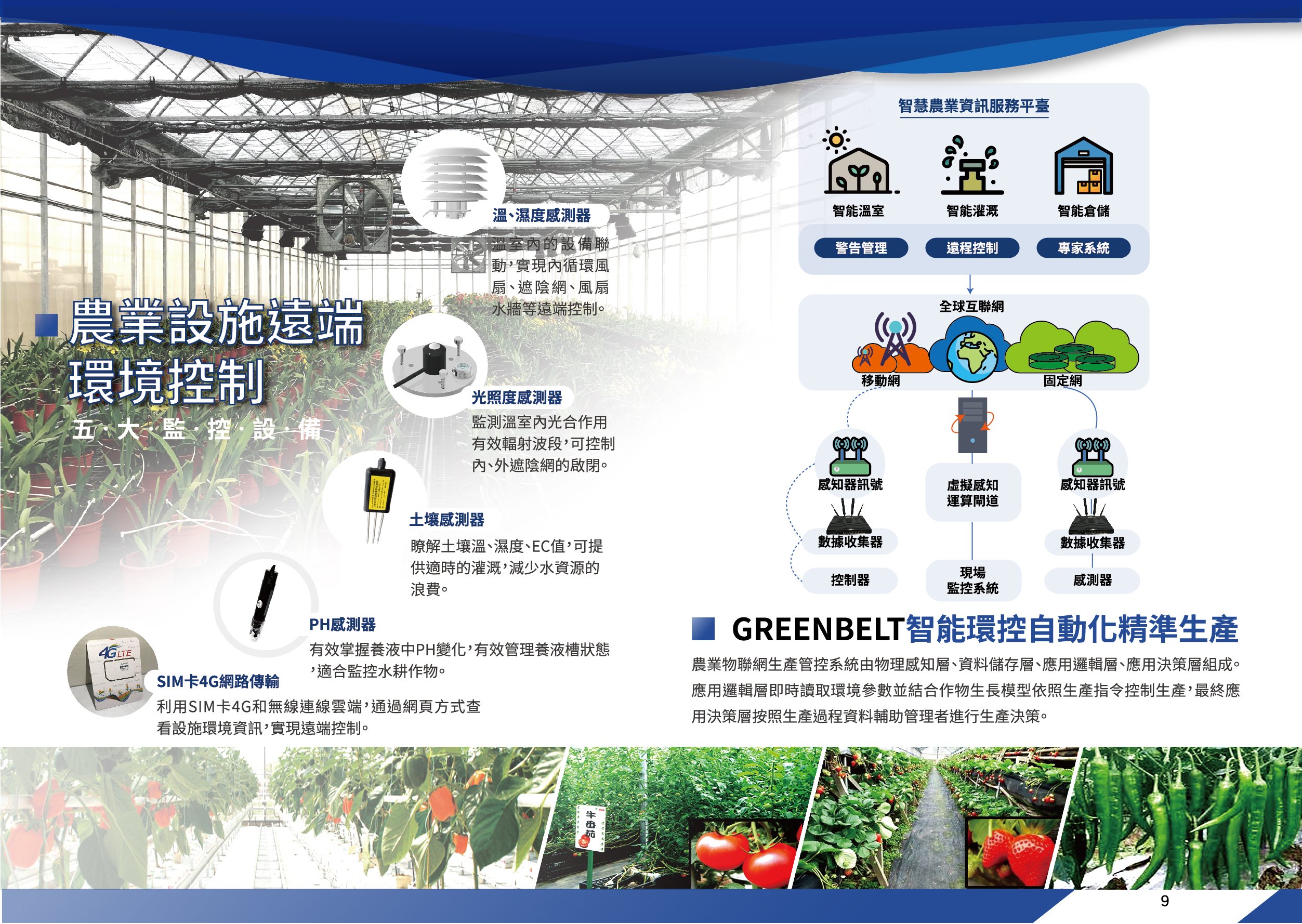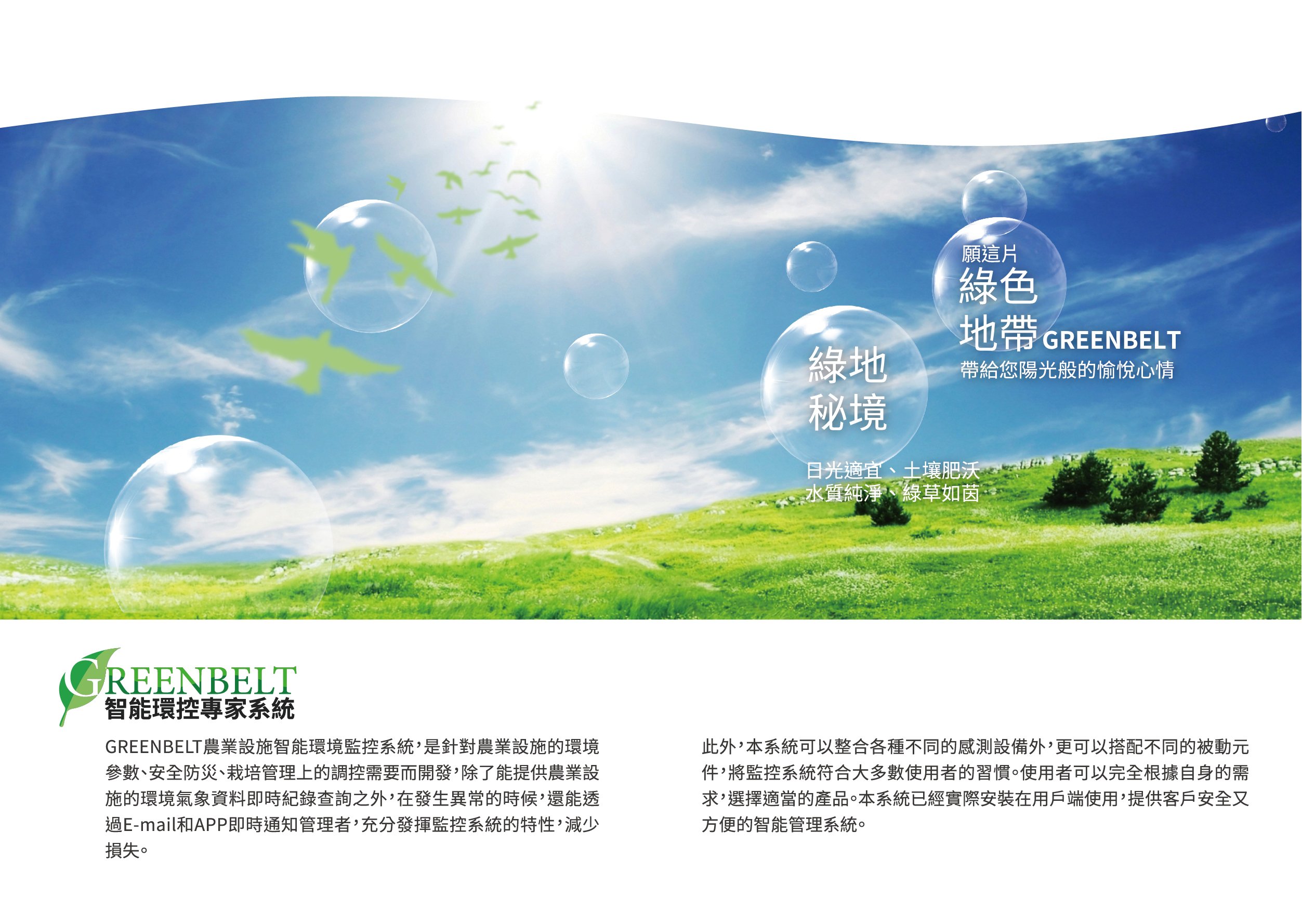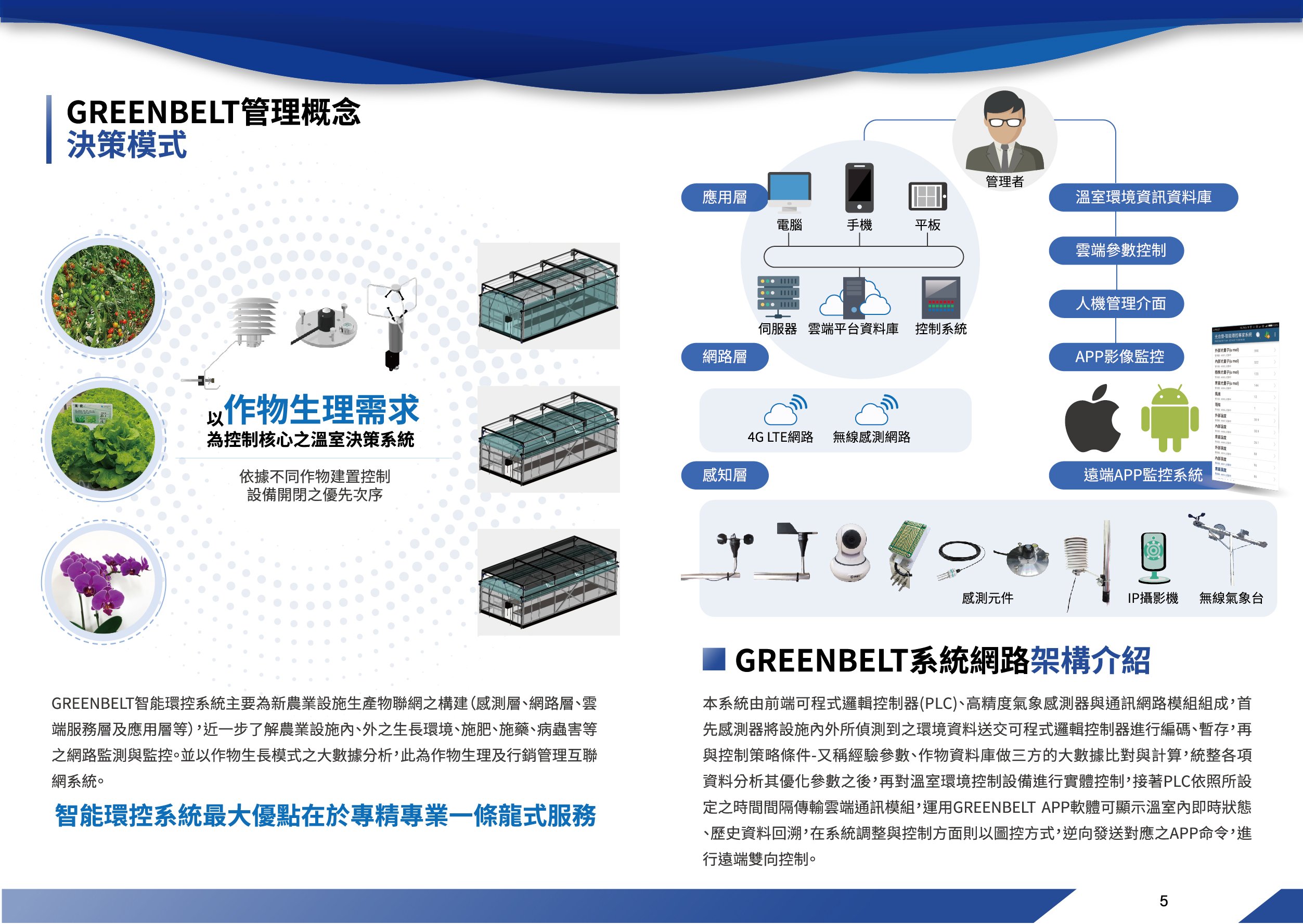 GREENBELT系統主要為新農業設施生產物聯網之構建(感測層、網路層、雲端服務層及應用層等),近一步了解農業設施內、外之生長環境、施肥、施藥、病蟲害等之網路監測與監控。並以作物生長模式之大數據分析,此為作物生理及行銷管理互聯網系統。
