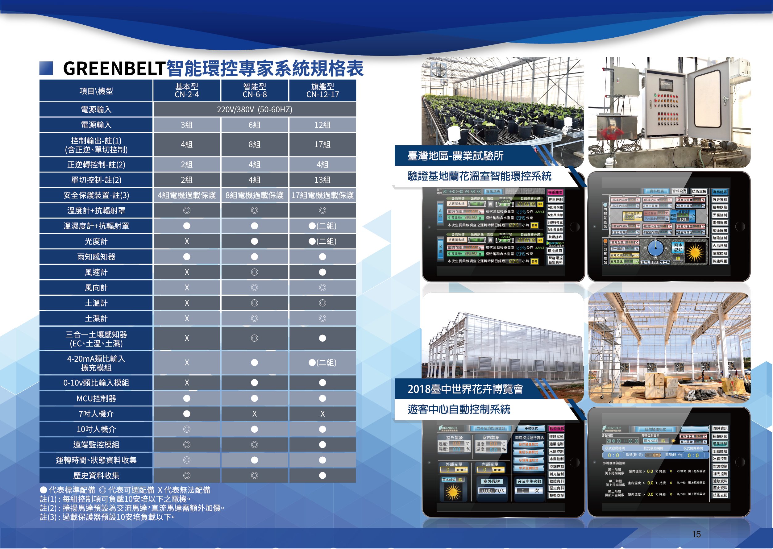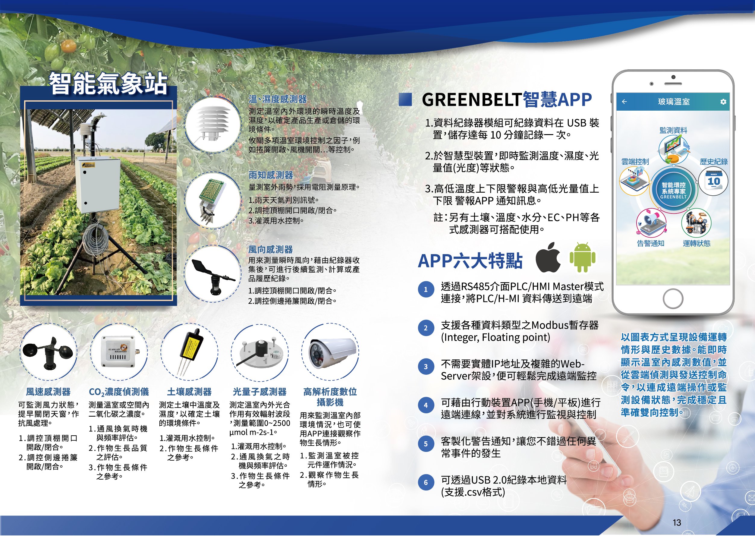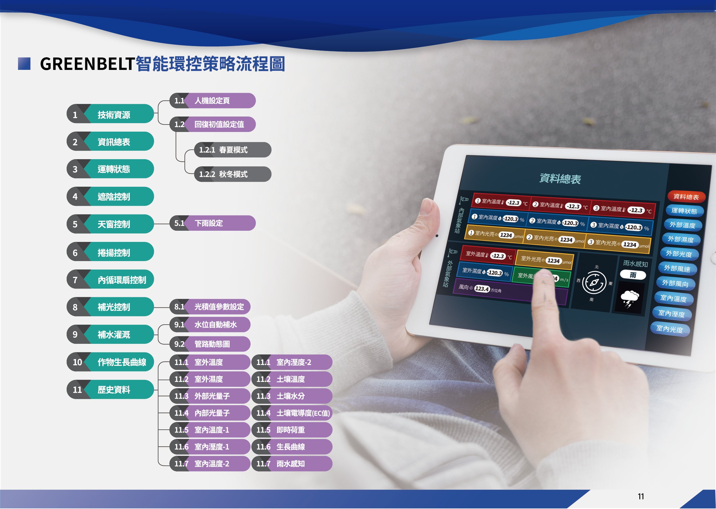 GREENBELT系統主要為新農業設施生產物聯網之構建(感測層、網路層、雲端服務層及應用層等),近一步了解農業設施內、外之生長環境、施肥、施藥、病蟲害等之網路監測與監控。並以作物生長模式之大數據分析,此為作物生理及行銷管理互聯網系統。