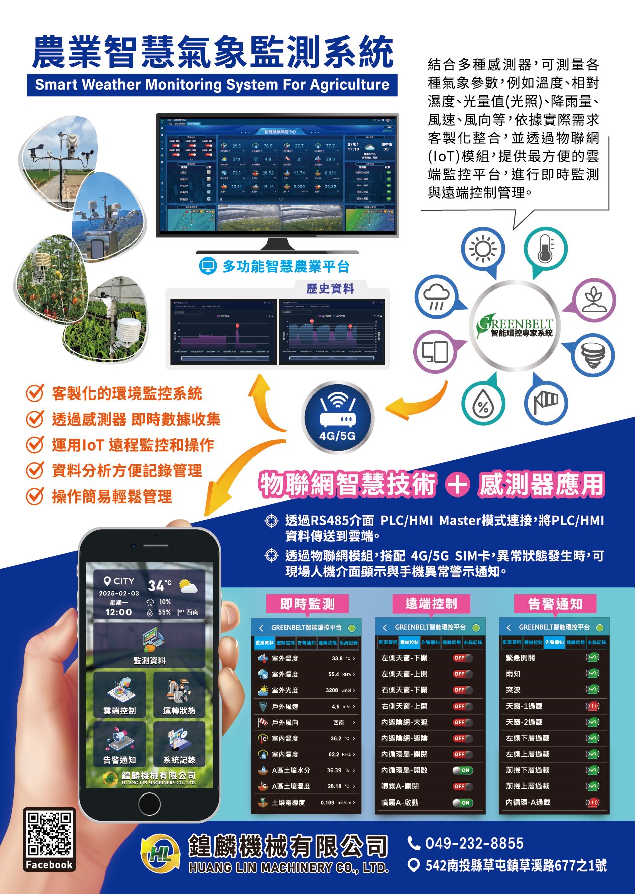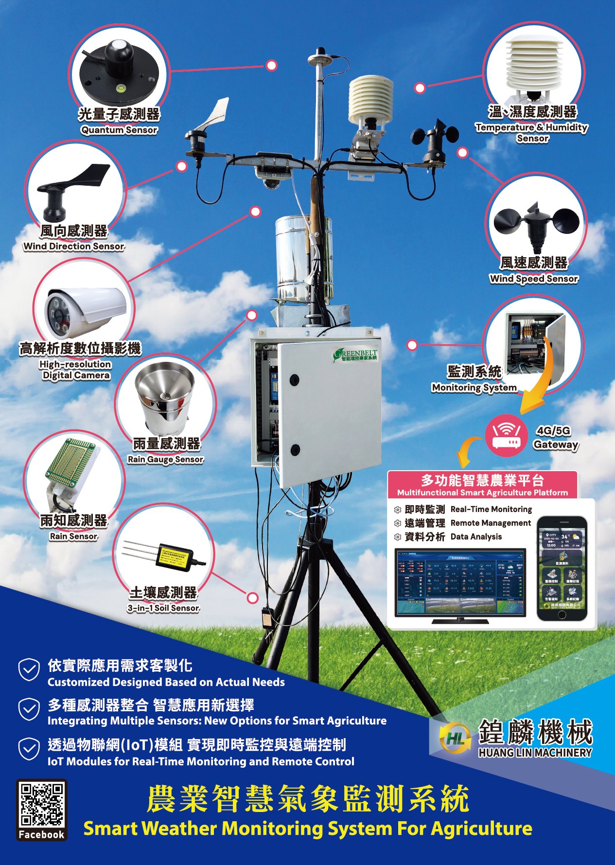 結合多種感測器,可測量各種氣象參數,例如溫度、相對濕度、光量值(光照)、降雨量、風速、風向等,依據實際需求客製化整合,並透過物聯網(IoT)模組,提供最方便的雲端監控平台,進行即時監測與遠端控制管理。